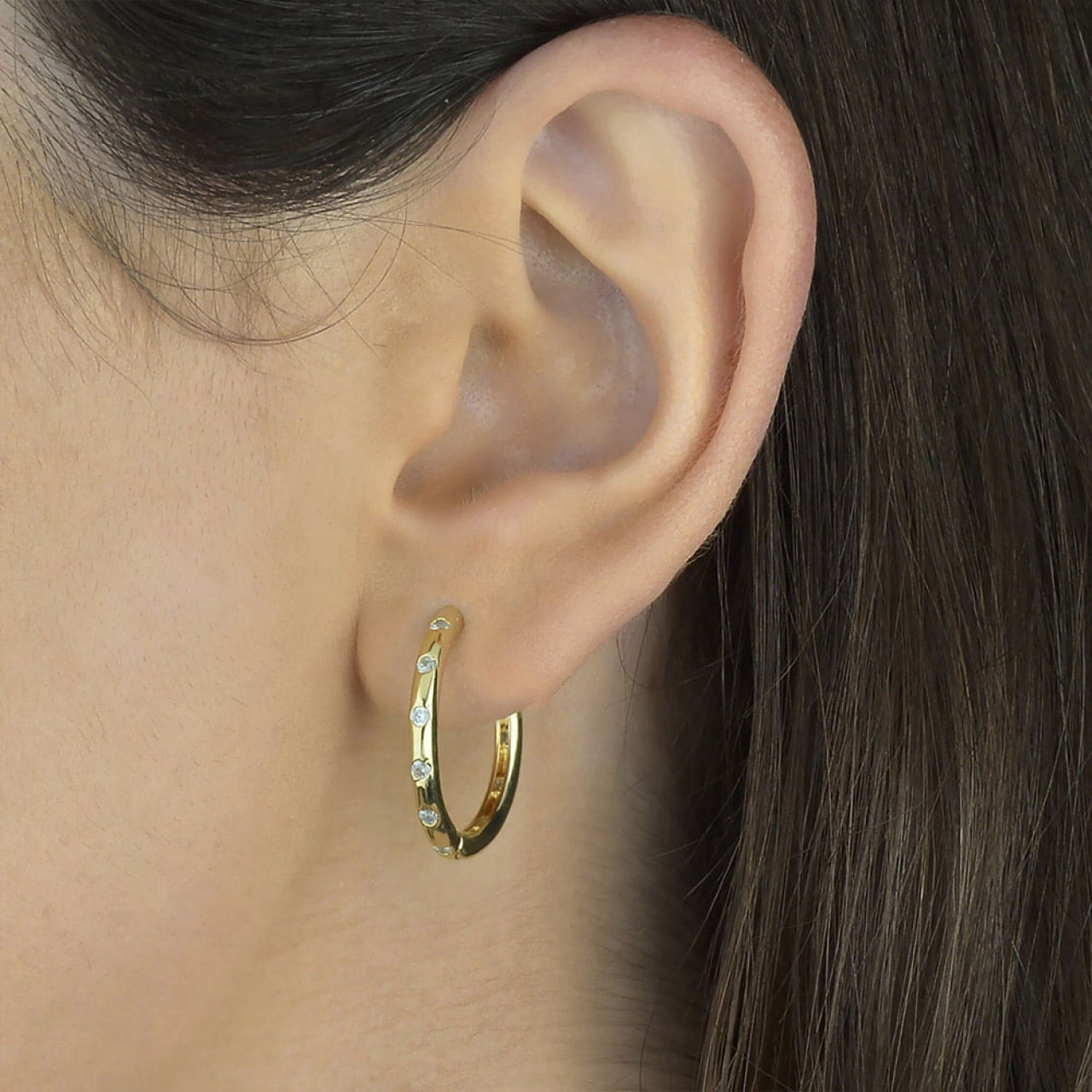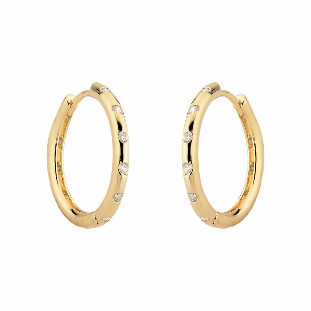 Descrição: Brinco argola com pontos de micro zircônias, fecho click. Banhado a ouro.