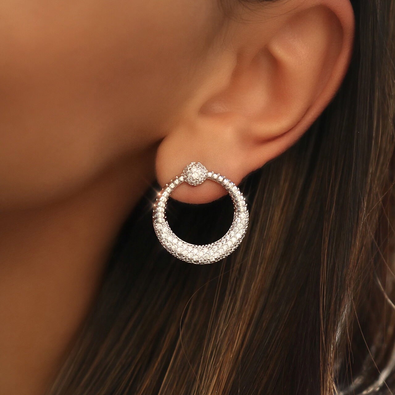 Descrição: Brinco redondo com zircônias cravejadas, banhado a ródio branco.