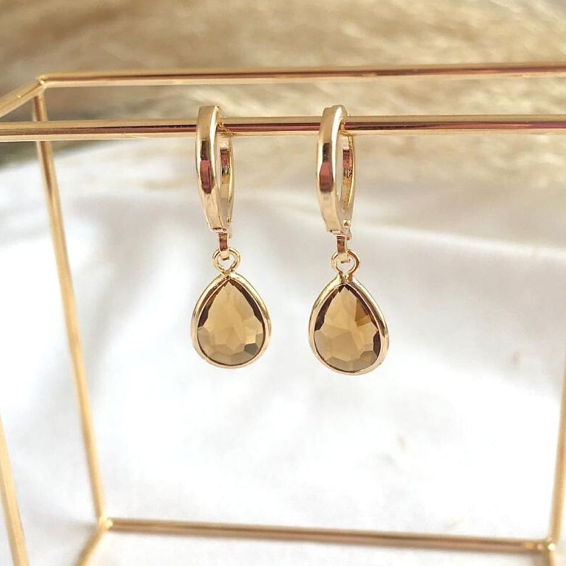 Descrição: Brinco argolinha gota cristal marrom, banhado a ouro.