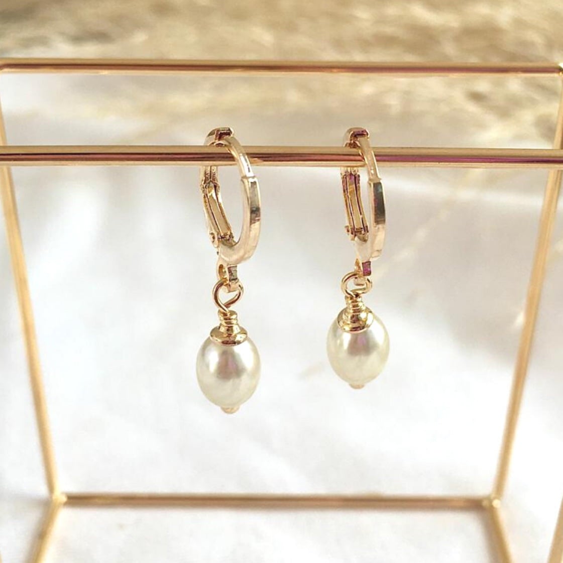 Descrição: Brinco argolinha pingente pérola, banhado a ouro.