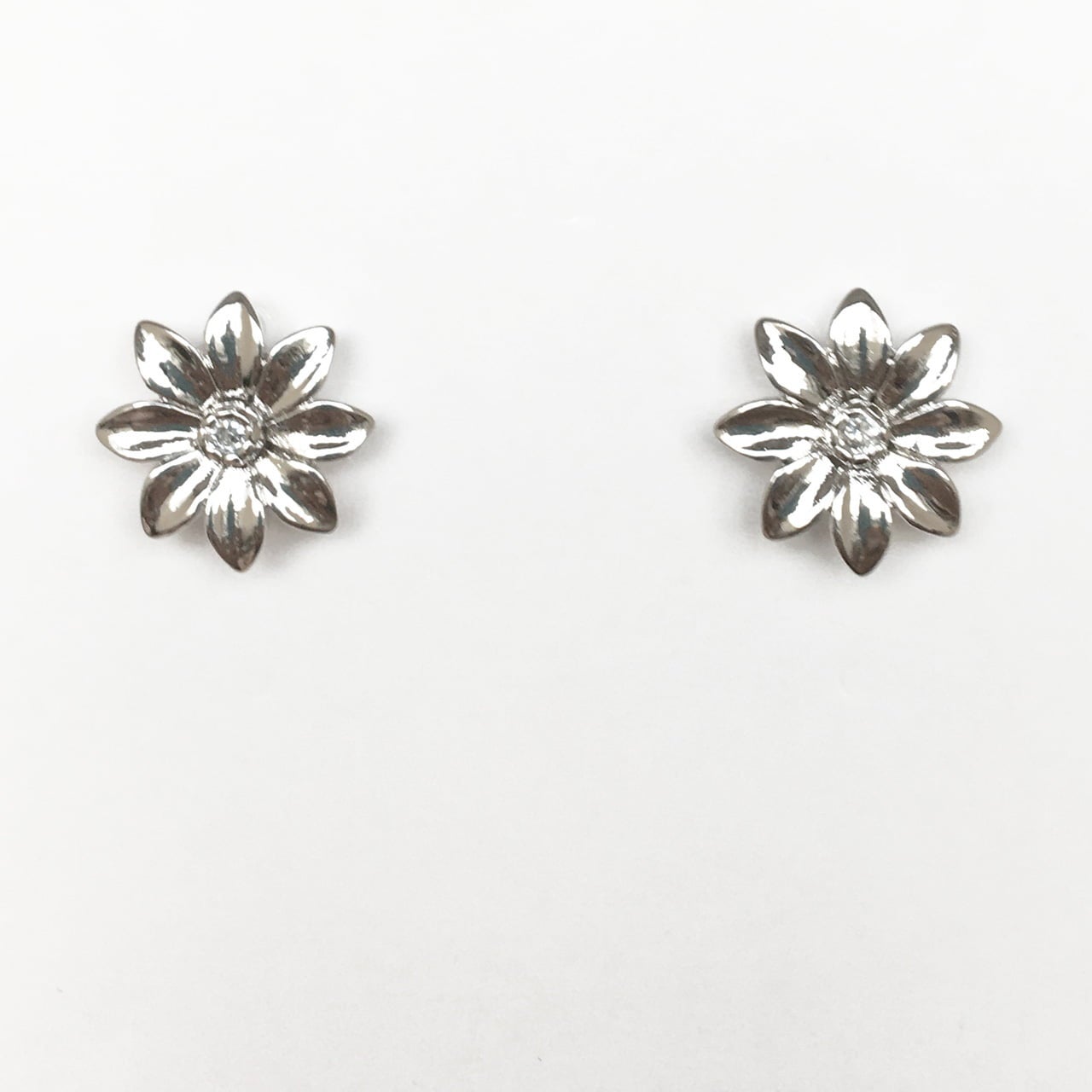 Descrição: Brinco flor lisa com zircônia no meio em ródio branco