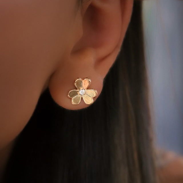 Descrição: Brinco trevo liso lisa com zircônia no meio em ouro
