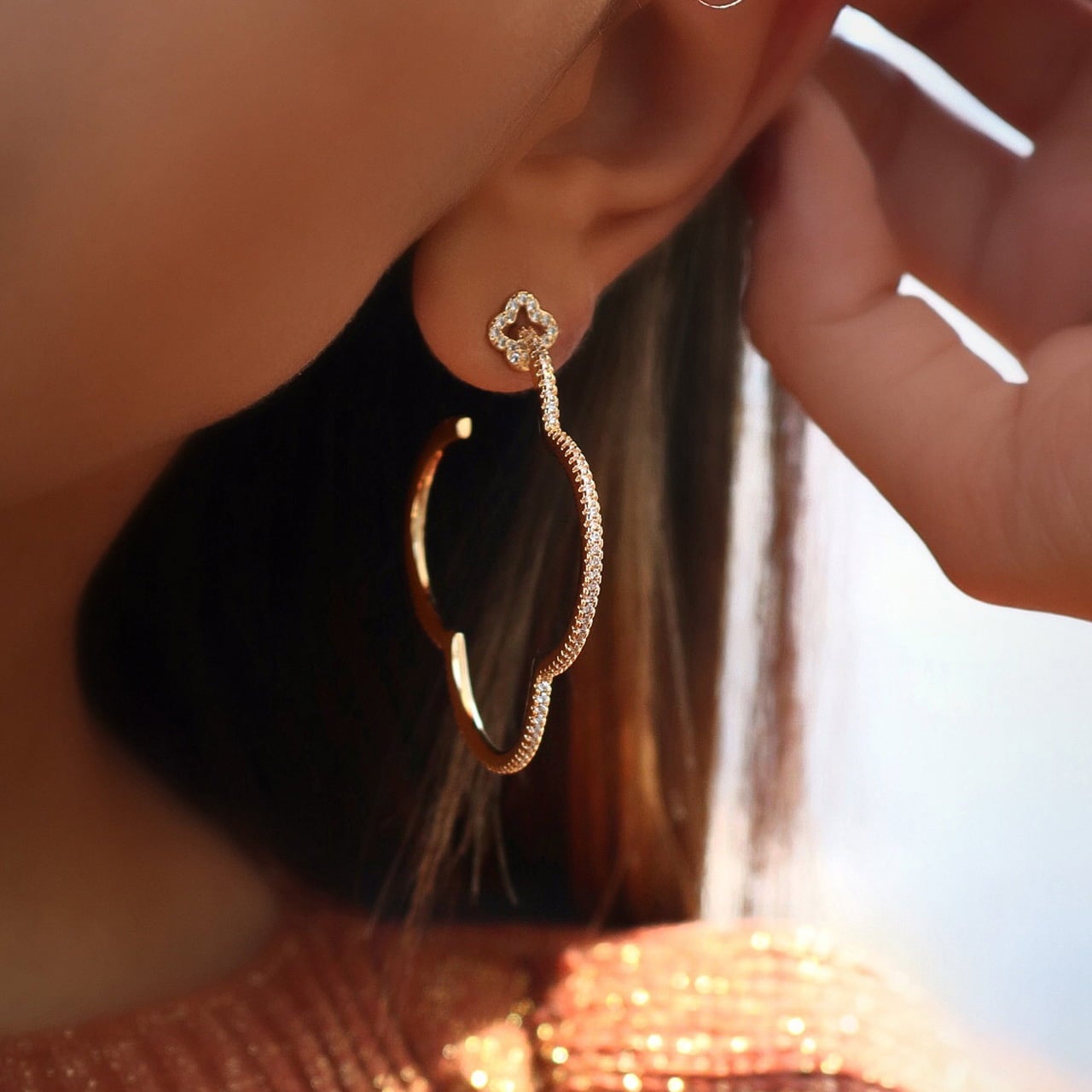 Descrição: Brinco trevo vazado em zircônia, banhado a ouro.