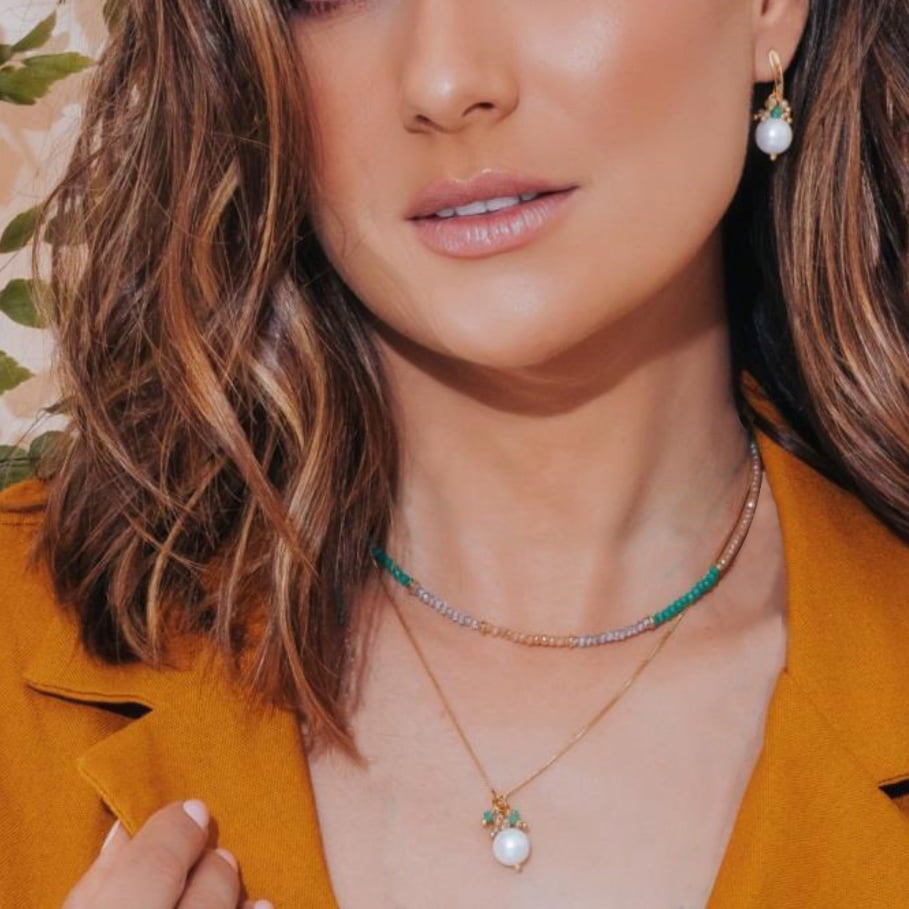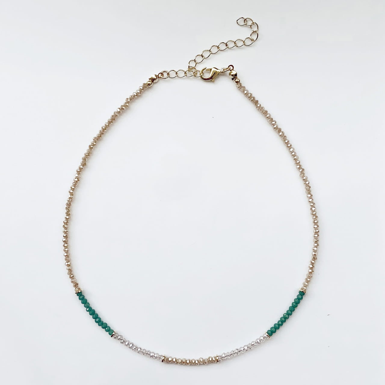 Descrição: Colar cristal verde e bege dourado. Banhado a ouro.