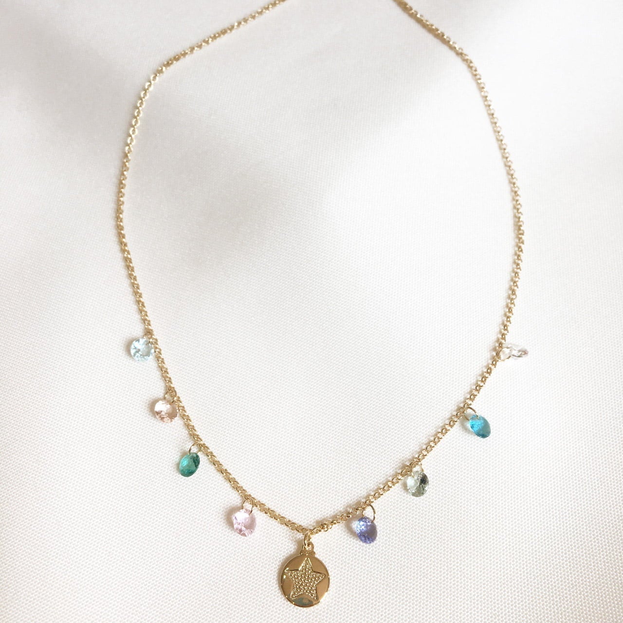 Descrição: Colar medalhinha estrela com cristais vidro colorido. Banhado a ouro.
