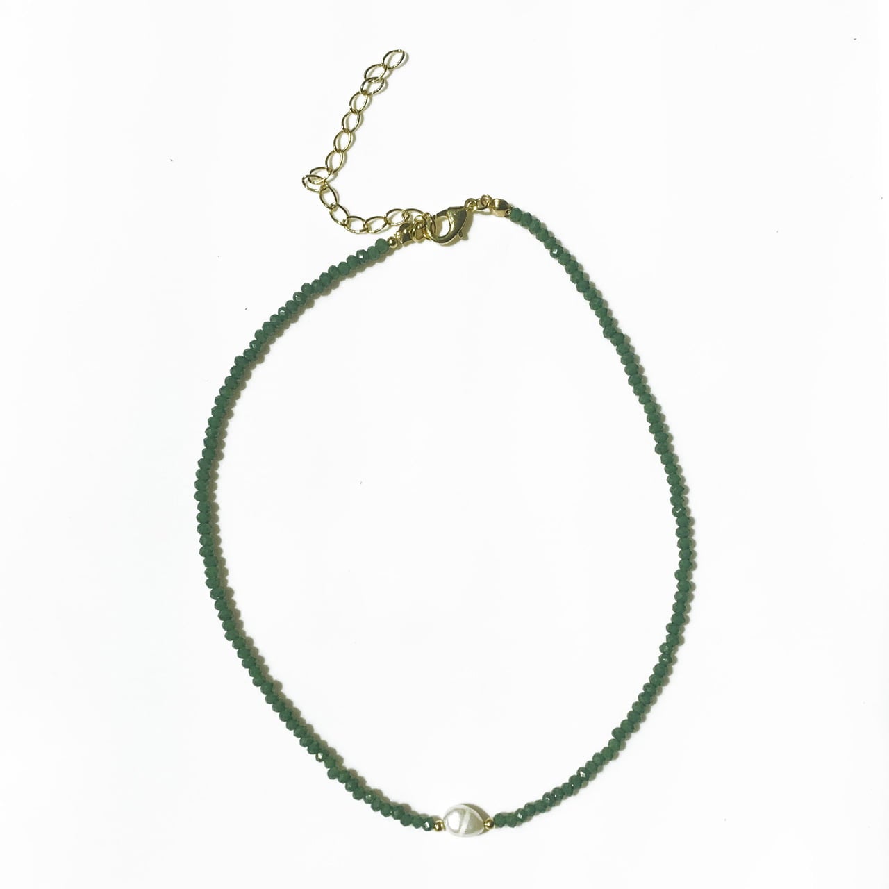 Descrição: Colar tipo choker cristal verde com pérola de água doce, banhado a ouro.
