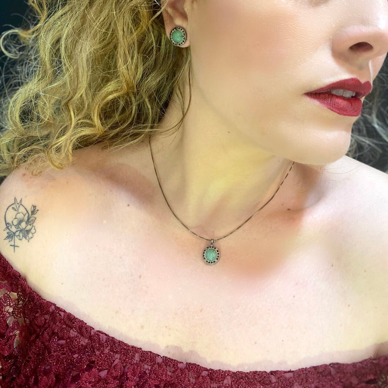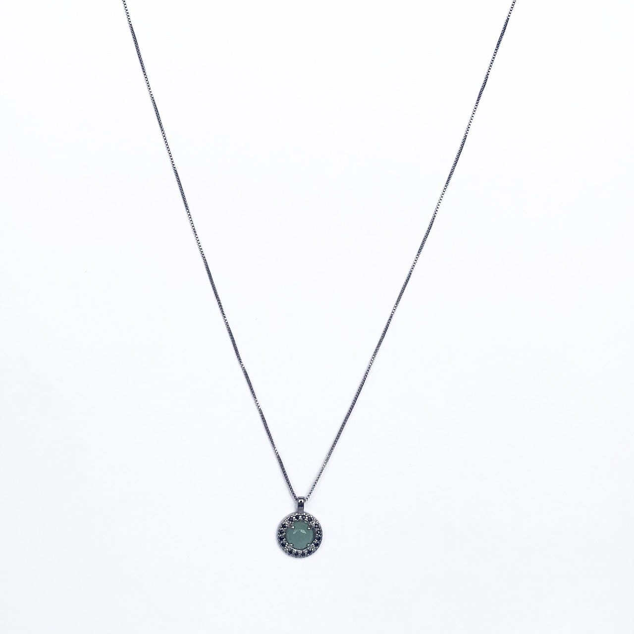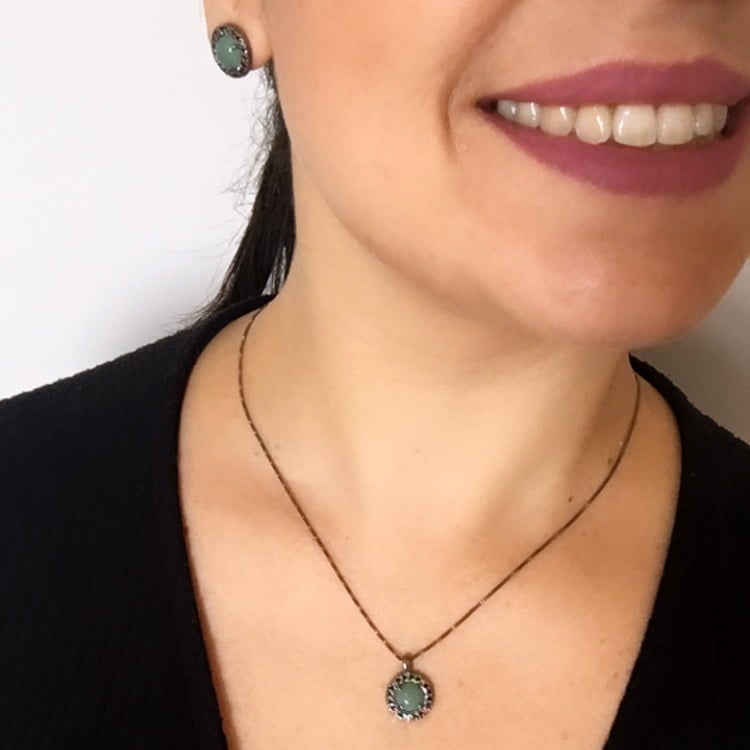 Descrição: Conjunto colar e brinco pedra natural Quartzo verde em ródio negro