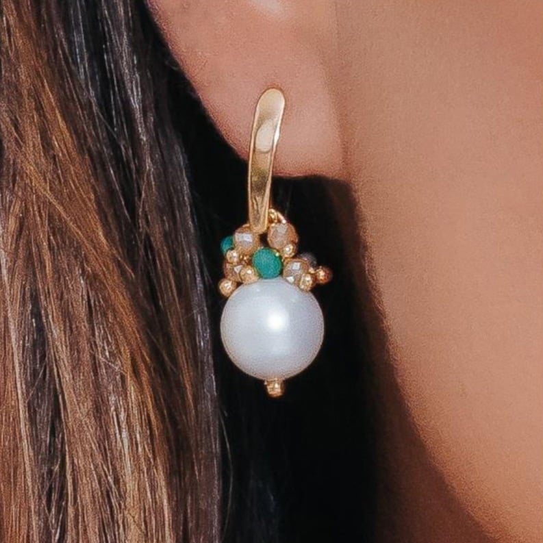 Mix colar e brinco com cristais e pérola shell, banhado a ouro.