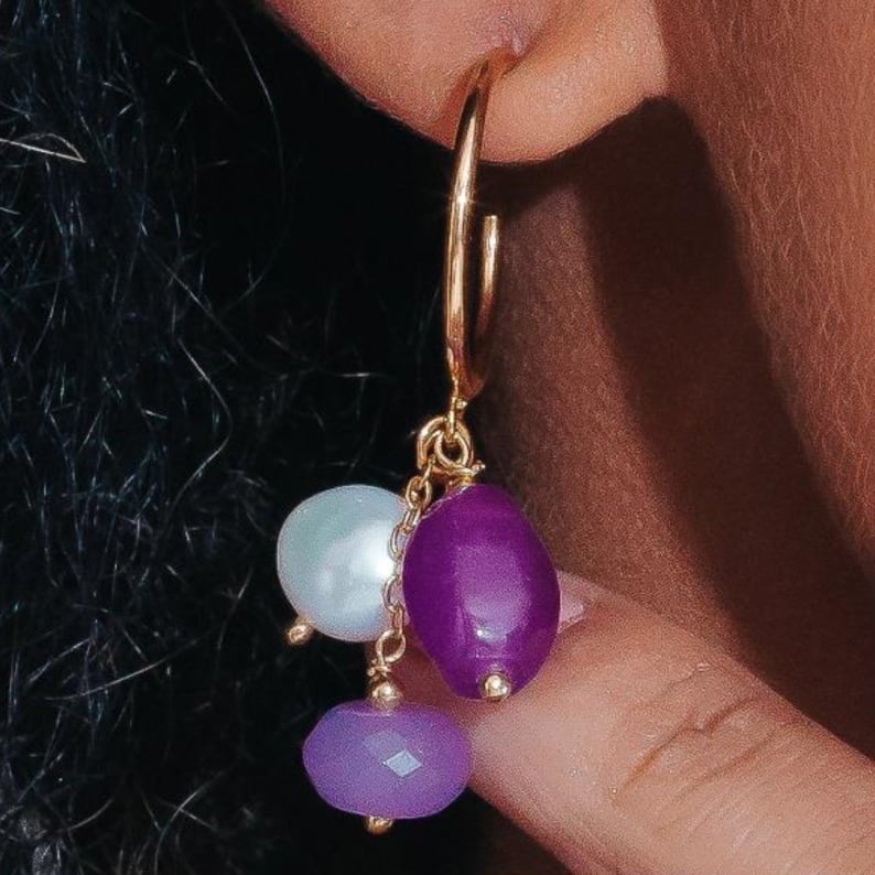 1 × Brinco argola com pingente de jade ametista e pérola banhado a ouro