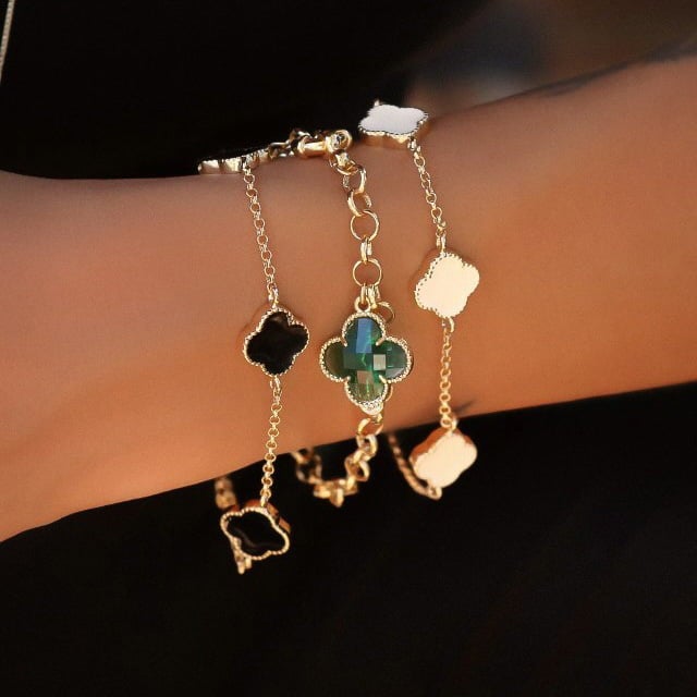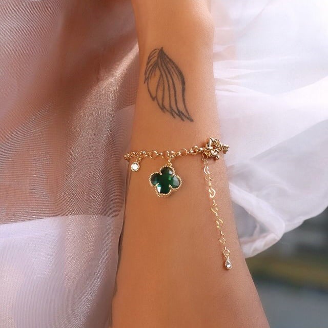Descrição: Pulseira elos português com trevo cristal e fecho boia banhado a ouro