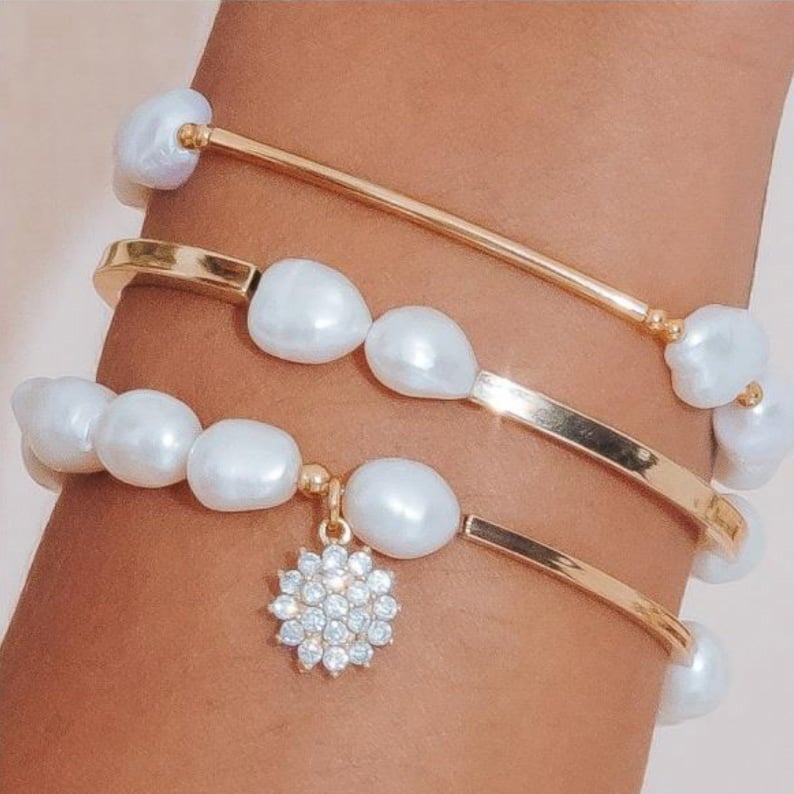 Descrição: Pulseira canutilho com pérolas de água doce e pingente de zircônia, em elástico. Banhada a ouro.